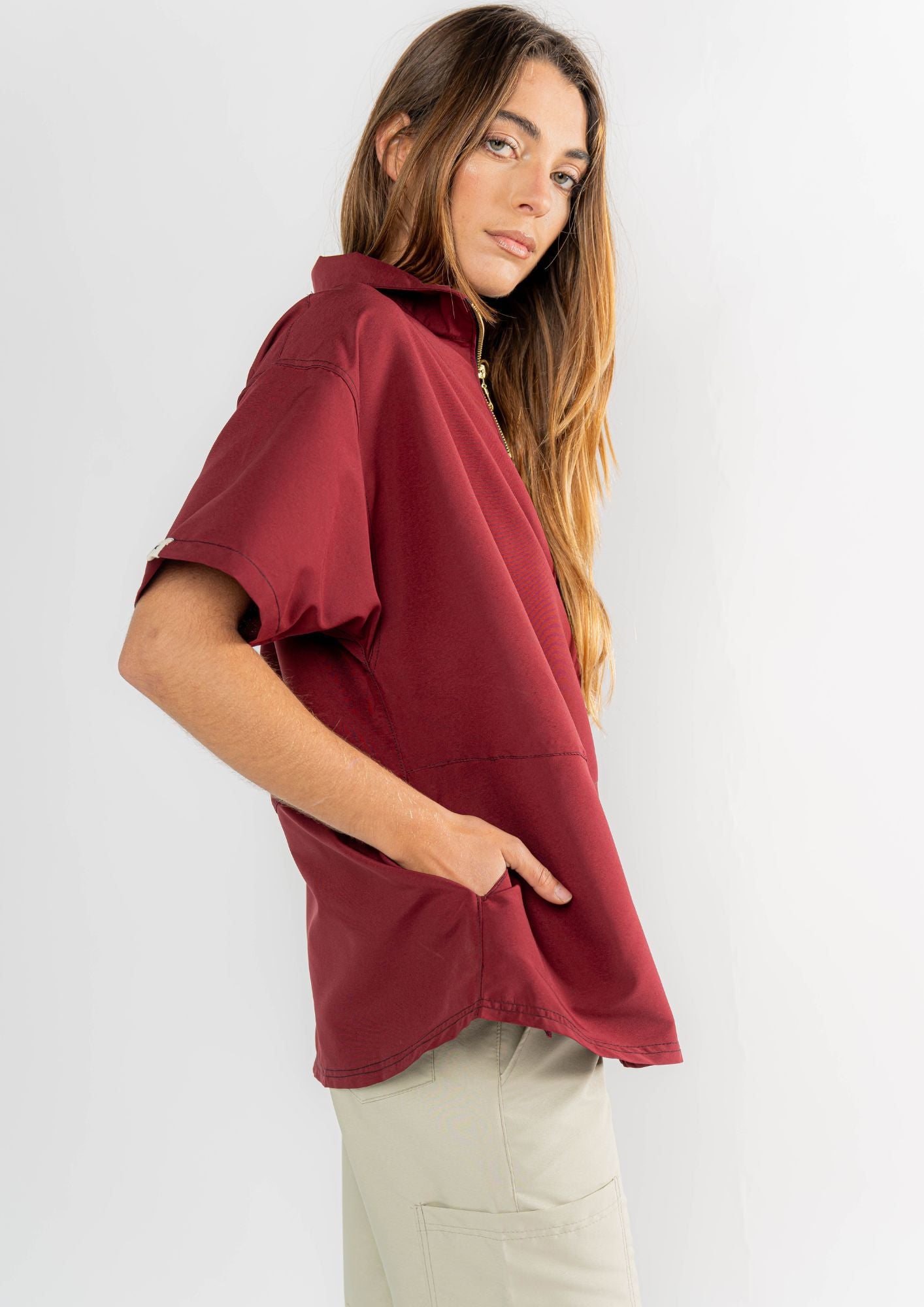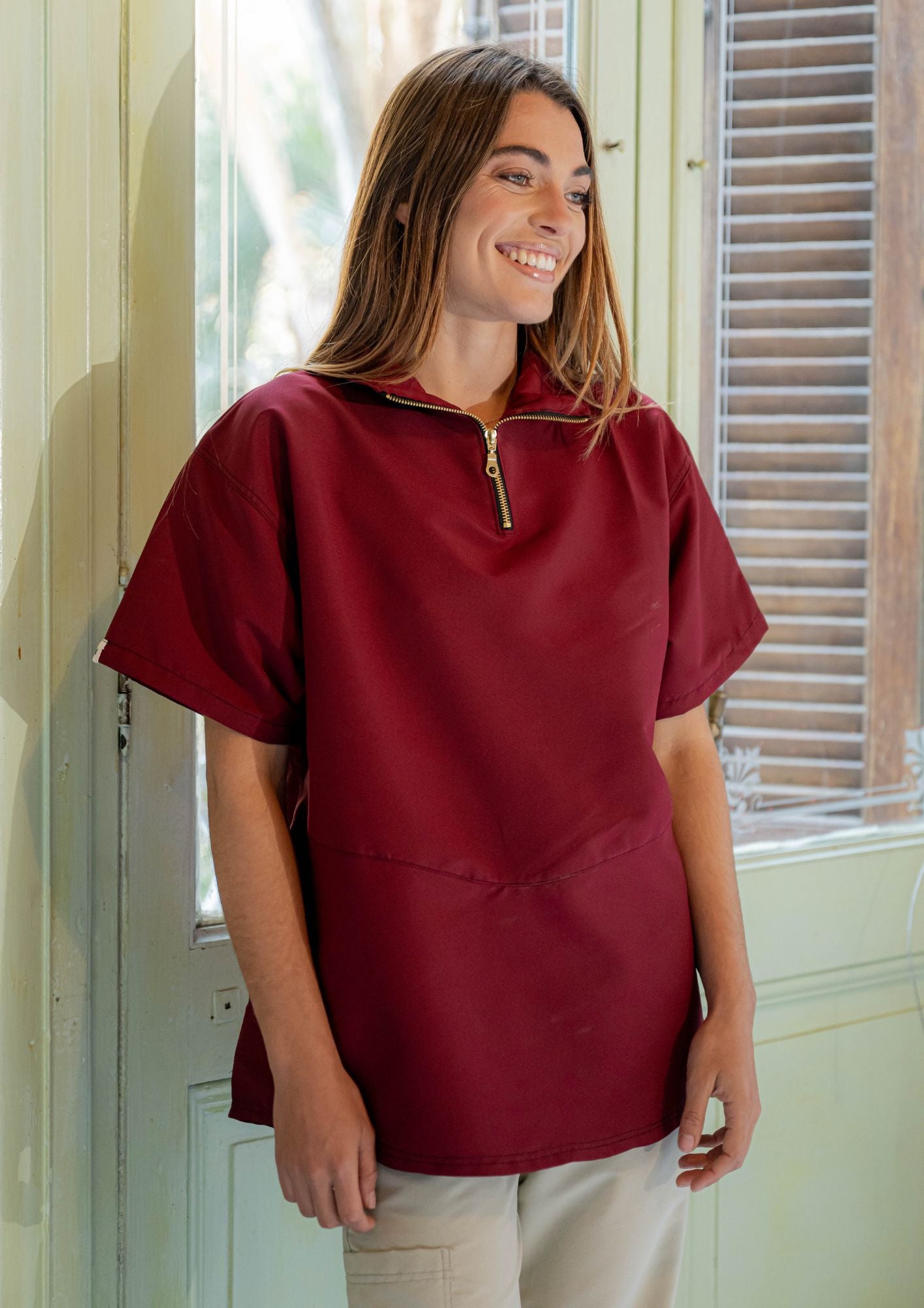 Casaca de mangas amplias.  Cuello alto con cierre y bolsillos laterales.